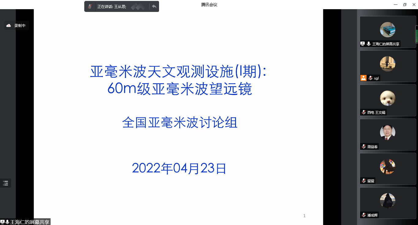 王海仁副研究员以《亚毫米波天文观测设施(I期): 60m级亚毫米波望远镜》为题,在国际天文界纷纷规划建设下一代亚毫米波单天线设备的背景下,介绍了我国亚毫米波讨论组提出的60米级亚毫米单天线望远镜的设想,详细介绍了60米亚毫米波望远镜在我国规划中的定位和作用、重要的科学目标和其对设备先进性能的需求,以及项目建设的紧迫性和项目的可行性。