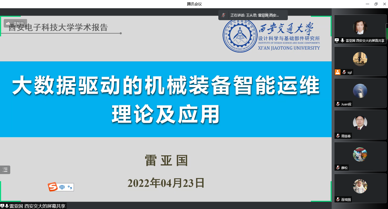 雷亚国教授为师生作题为《大数据驱动的机械装备智能运维理论及应用》的报告,他以机械装备的生命周期(设计、制造和运维)为切入点,指出机械故障是其安全可靠运行的潜在隐患,智能运维则是保障机械装备安全运行的重要手段,介绍了团队在机械智能运维领域的最新理论研究成果,详细介绍了其在风电、热电、核电、重卡、新能源汽车、武器、工业机器人等装备安全运维中的应用情况。雷教授的报告深入浅出,内容丰富,参与的师生通过视频连线、弹幕留言等方式与报告人进行互动交流,让聆听报告的师生们受益匪浅。