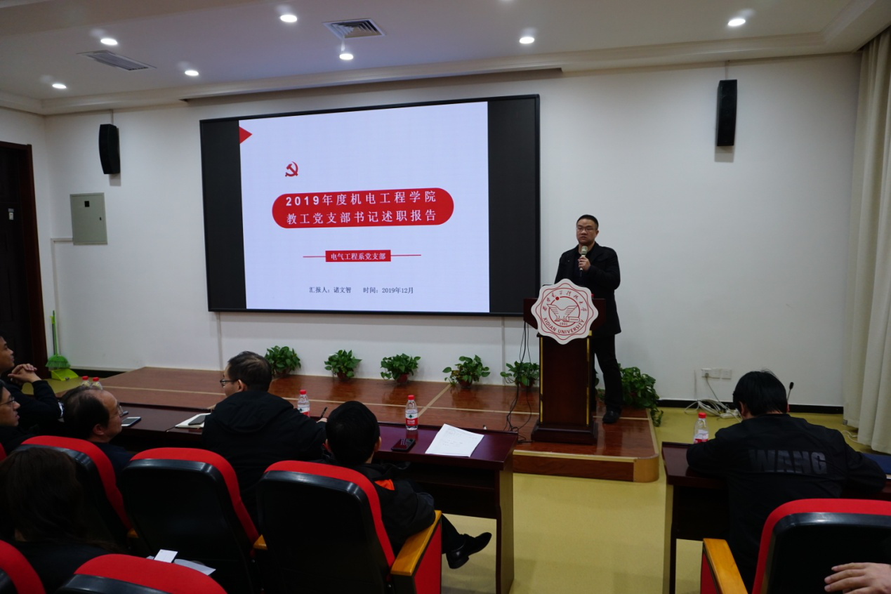 2019年12月31日下午,英国beat365官方网站于北校区主楼3区237报告厅召开了党员代表会议。学院96名师生党员代表参加会议,党委组织部金阳群同志应邀参加会议,会议由学院副院长陈武同志主持。会议听取了2019年度英国beat365官方网站教工党支部书记抓党建述职,学院各系所、机关等8位教工支部书记先后对2019年支部工作开展情况进行了述职。各教工党支部书记从开展“不忘初心、牢记使命”主题教育情况、党支部组织建设情况、师德师风与课程思政情况、不足与下一步工作规划等方面进行了汇报,总结过去,展望未来。各教工支部联系党委委员和院领导对述职情况进行了点评,充分肯定了各支部在2019年度的工作成效,并针对存在问题提出了改进建议。与会党员代表在述职结束后以填写在线问卷的形式,对各教工支部书记的述职进行了现场测评。