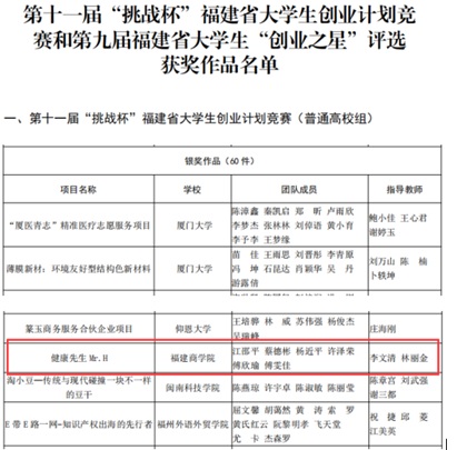 由团省委、省教育厅、省人社厅、省科协、省学联联合举办,阳光学院、共青团福州市委承办的第十一届“挑战杯”福建省大学生创业计划竞赛已落下帷幕,新葡平台官网参赛项目《健康先生Mr.H》荣获银奖。